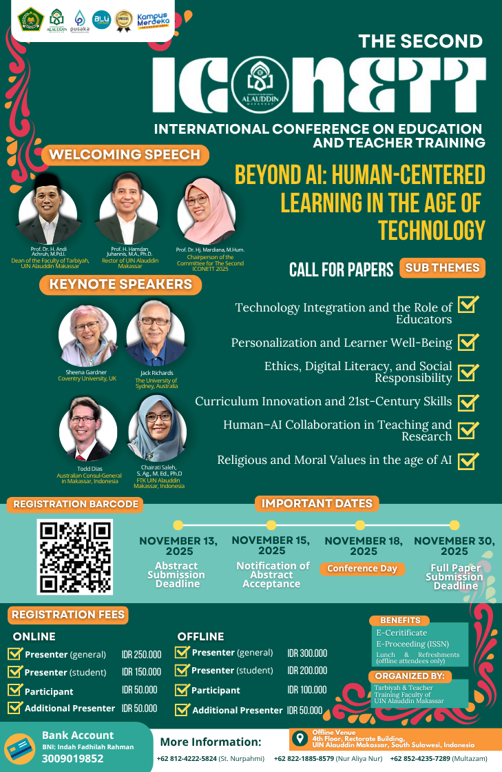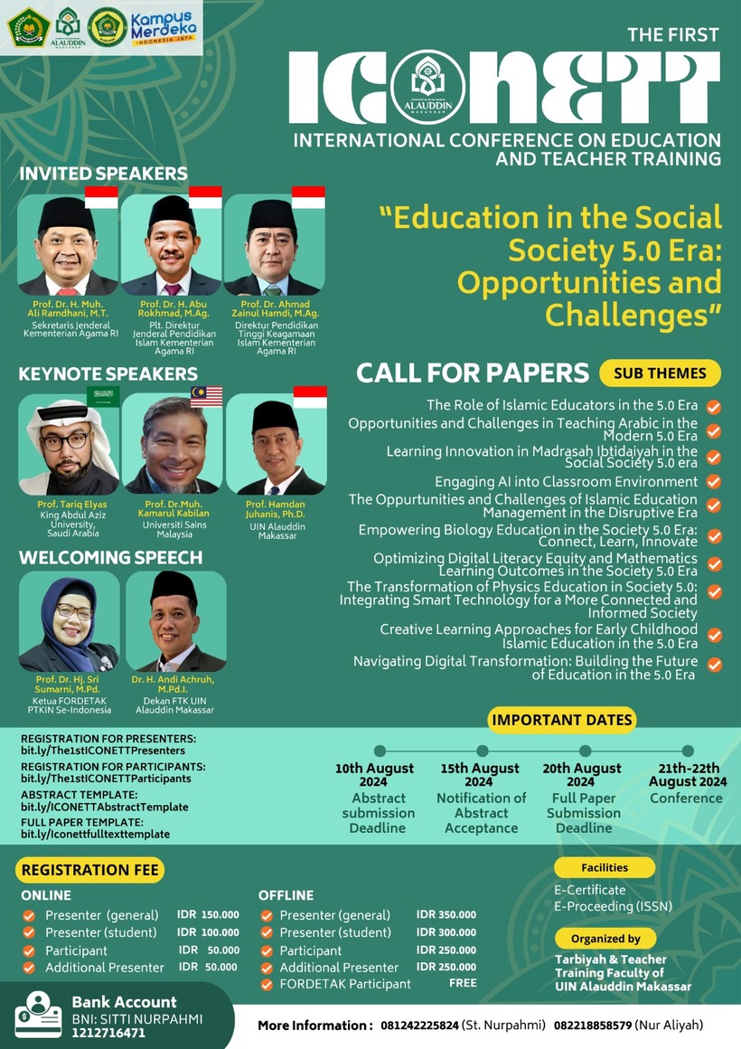 June 21, 2025 – June 22, 2025CALL FOR PRESENTATIONWe are thrilled to invite you to participate in The National Seminar on English Language Teaching (NELT) 2025Theme: "Navigating Global Treads in ELT: Challenges and Opportunities in indonesian Context"This seminar is organized by English Education Department of Universitas Islam Negeri Alauddin Makassar). It will provide opportunities for the delegates to exchange new ideas and experiences, establish business or research relations, and find global partners for future collaboration.The event will be held on June 21th, 2025 in hybrid mode with presentations delivered by researchers from the national universities, including presentations from keynote speaker and scientific parallel session presentations.Sub-theme: